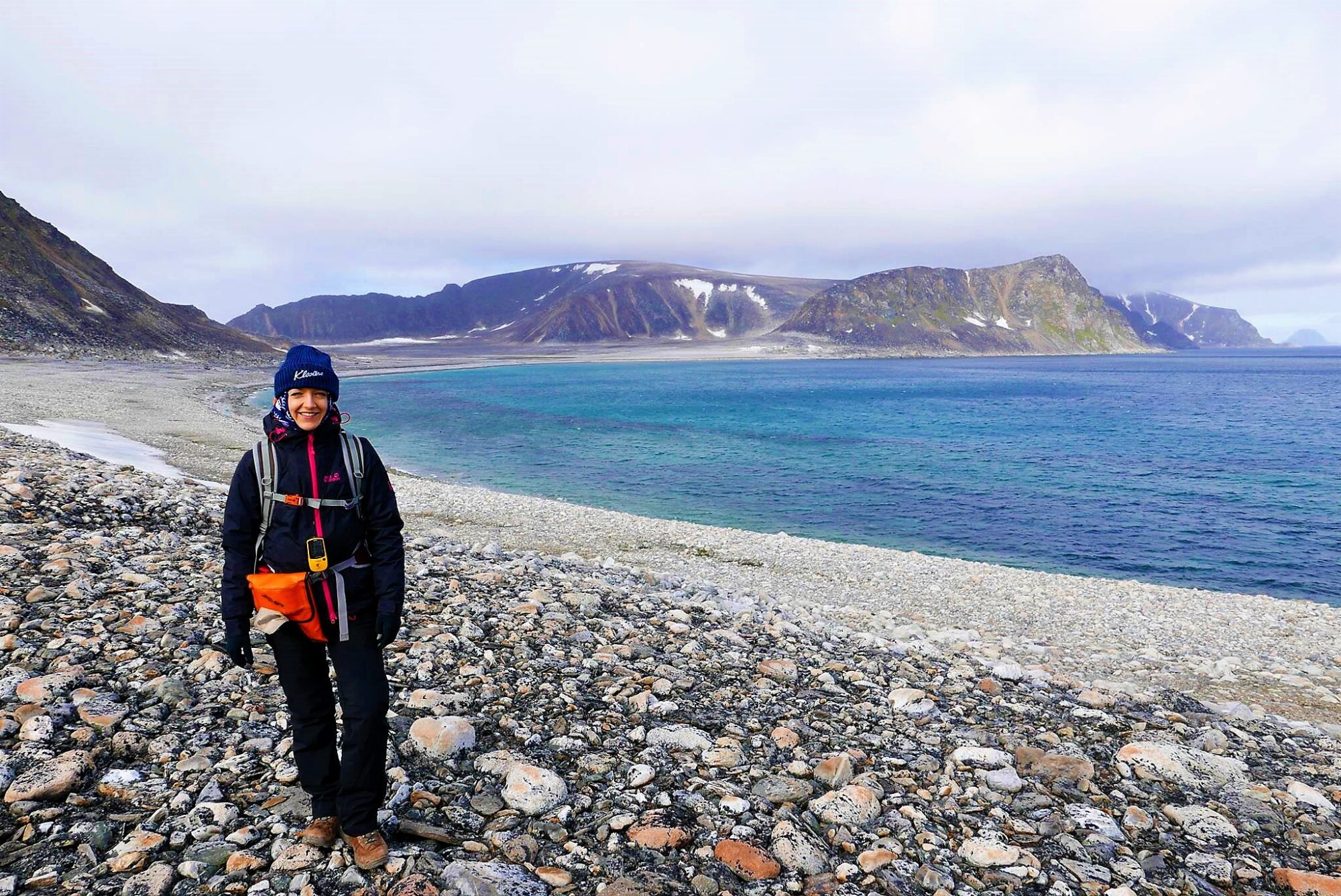 These were much needed as we would be out on the islands from 8 am to around 5 pm, come cold, rain or shine. Out of the group of twenty, in the field we split into groups of four; each with a rifle, two flare guns, and a radio, which along with my saw for sampling wood and the rock-saw for boulders, we felt very well kitted out, and clearly upped my confidence judging from my posing in photo 5… Such precautions soon felt appreciated, as on our first day our group stumbled across polar bear tracks on the beach, fresh enough to mean a bear had passed within the last couple of days! Thankfully we never had any encounters with bears in the field, and I never fell in the sea, but I collected plenty of driftwood and found the landscape awe-inspiring and beyond everything I imagined. We had some fabulous wildlife sights, including walruses, reindeer, puffins and arctic fox. Such a list would have been great on its own, but I have to admit they were outdone when I got to fulfil that biggest wishes of all, catching sight of not just one wild polar bear but three, including one from the safety of a boat during a trip to see Pyramiden, a Russian mining town ~50km north of Longyearbyen. While passing a glacier at 11 pm in bright sunshine (24-hour daylight has its perks) we saw a relaxed-looking bear, reclining as if on a geological sun-lounger (photo 6), and looking more akin to a cuddly Paddington than a deadly Iorek Byrnison,. After all that training, it felt like this bear was flaunting how little he cared about our presence, and how clearly this was his domain; one to which we could only make a passing visit, corralled on boats, while he gazed down on his land of ice.